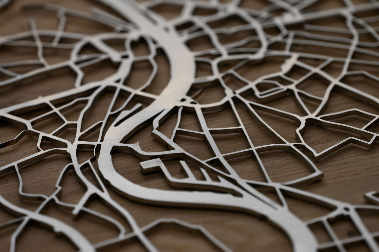 An erster Stelle steht die Auswahl der geographischen Form, die wir in Metall bannen wollen. Wenn wir uns (ggf. mit Ihrer Hilfe) für ein Motiv entschieden haben, erstellen wir eine digitale Version des Musters. Dabei steht die ästhetische Wirkung im Vordergrund – nicht alle Details können abgebildet werden, nicht alle Elemente einer Landkarte können überlagert werden. Zugleich geben die Modelle aber auch feinste Details wieder.